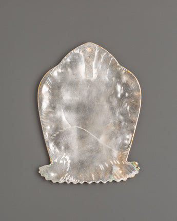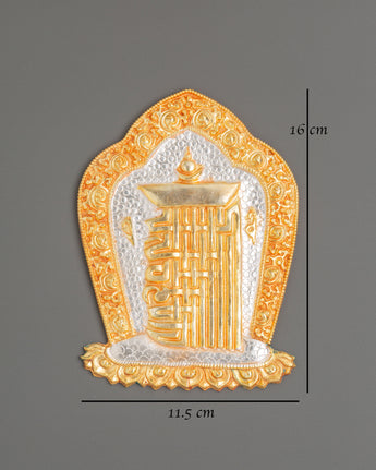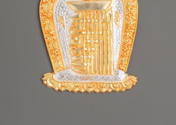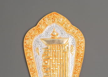 Radiating sacred brilliance, this Tibetan Kalachakra Symbol wall hanging is a captivating piece of spiritual craftsmanship. Carefully handcrafted from copper, it features layers of gold and silver plating, creating a mesmerizing balance of light and texture. The golden hues reflect divine power and prosperity, while the silver tones symbolize purity and peace—together, they represent the union of wisdom and compassion. Measuring 16 cm in height and 11.5 cm in width while weighing 0.13 kg, this elegant artwork feels both refined and substantial, making it perfect for display on sacred walls, shrines, or meditation spaces.