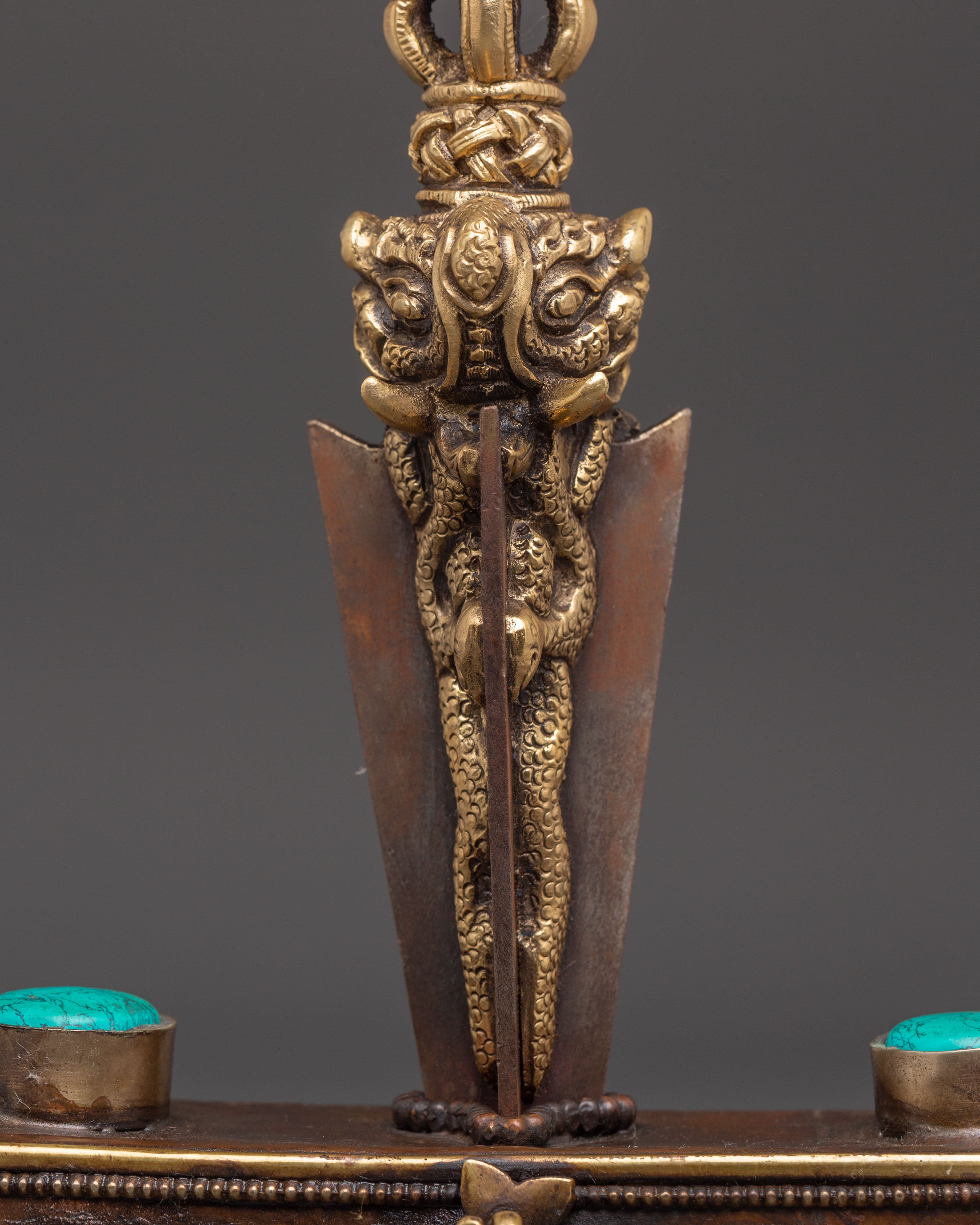 The magnificent Tibetan Phurba with Box exemplifies the rich creativity and spiritual depth of Himalayan handicraft. This ritual dagger, measuring 32cm in height and 5cm in width, weighs 5.03kg including its beautiful box and is made of copper, brass, white metal, and iron. This precious item is adorned with turquoise and coral stones, and each element represents wisdom, healing, and spiritual protection. The Phurba's beautifully carved handle and triple-edged blade symbolize the ability to change negative energy and restore equilibrium during ritual rites.
