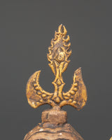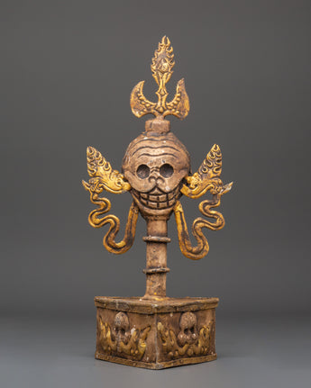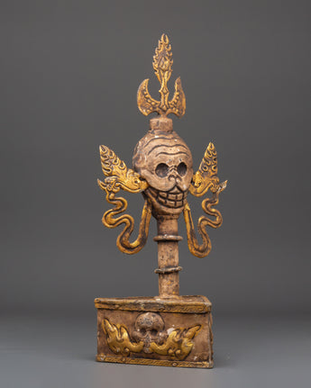 The Tibetan Skull Ritual Decor is not only a potent ceremonial object, but also a stunning altar piece for meditation rooms and holy areas. Its copper sheen reflects the mystical essence of Himalayan ritual art, serving as both a spiritual symbol and a meaningful ornamental element. The skull's design depicts the breakdown of the ego and the awakening of higher consciousness, which is a key tenet in Tantric Buddhism. This Tibetan Skull Ritual Decor is ideal for Buddhist art collectors, meditation practitioners, and those looking for decor that epitomizes transformation, knowledge, and tranquility. It brings the ageless spirit of the Himalayas into your holy space.