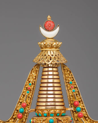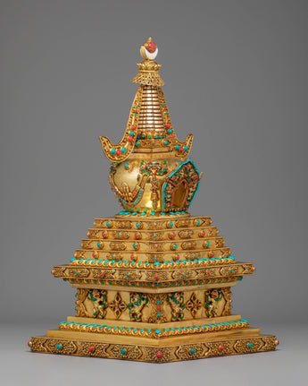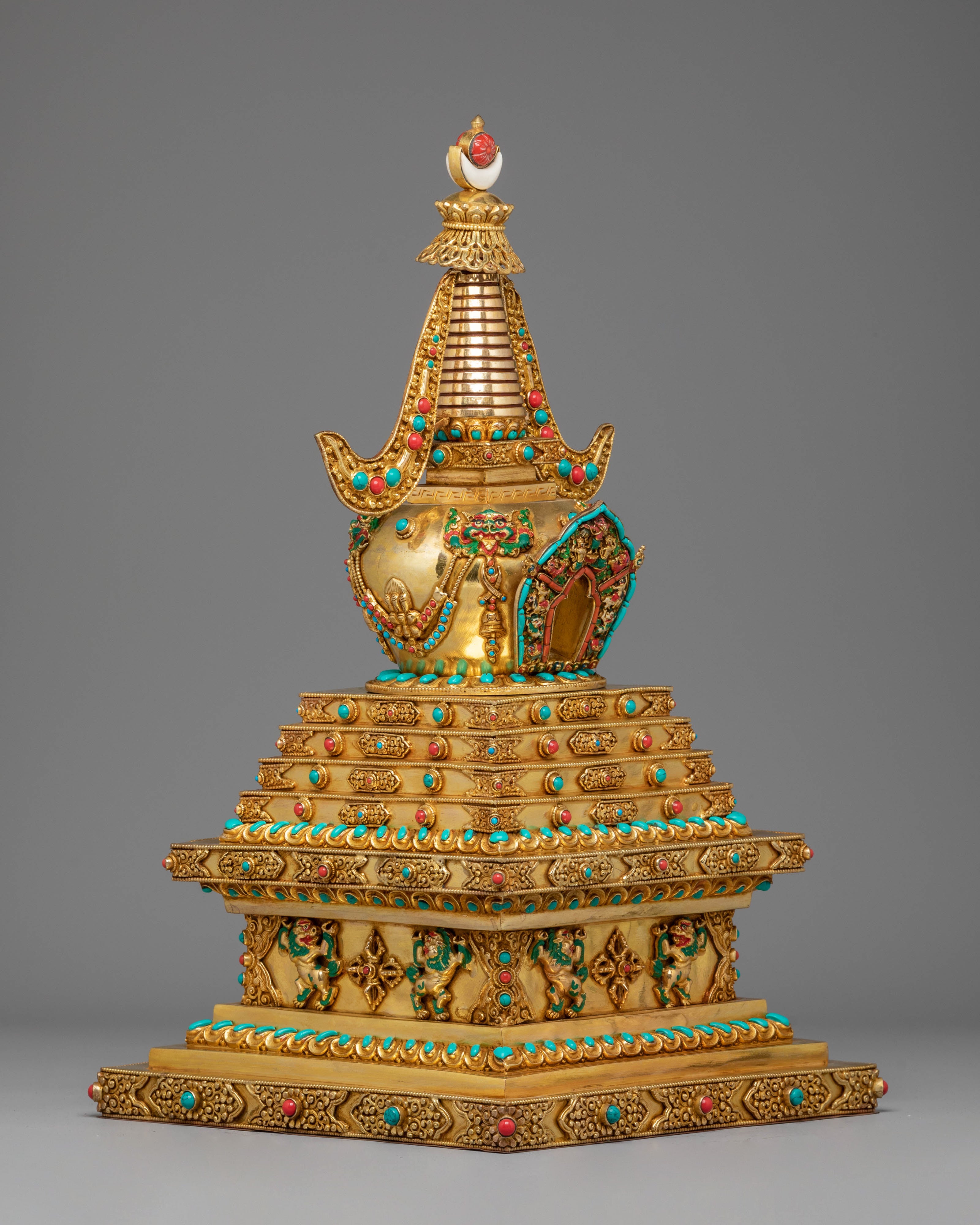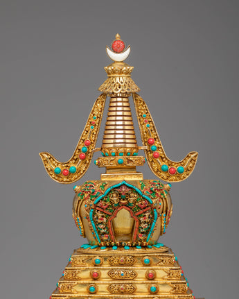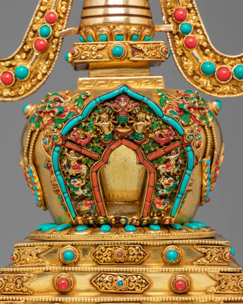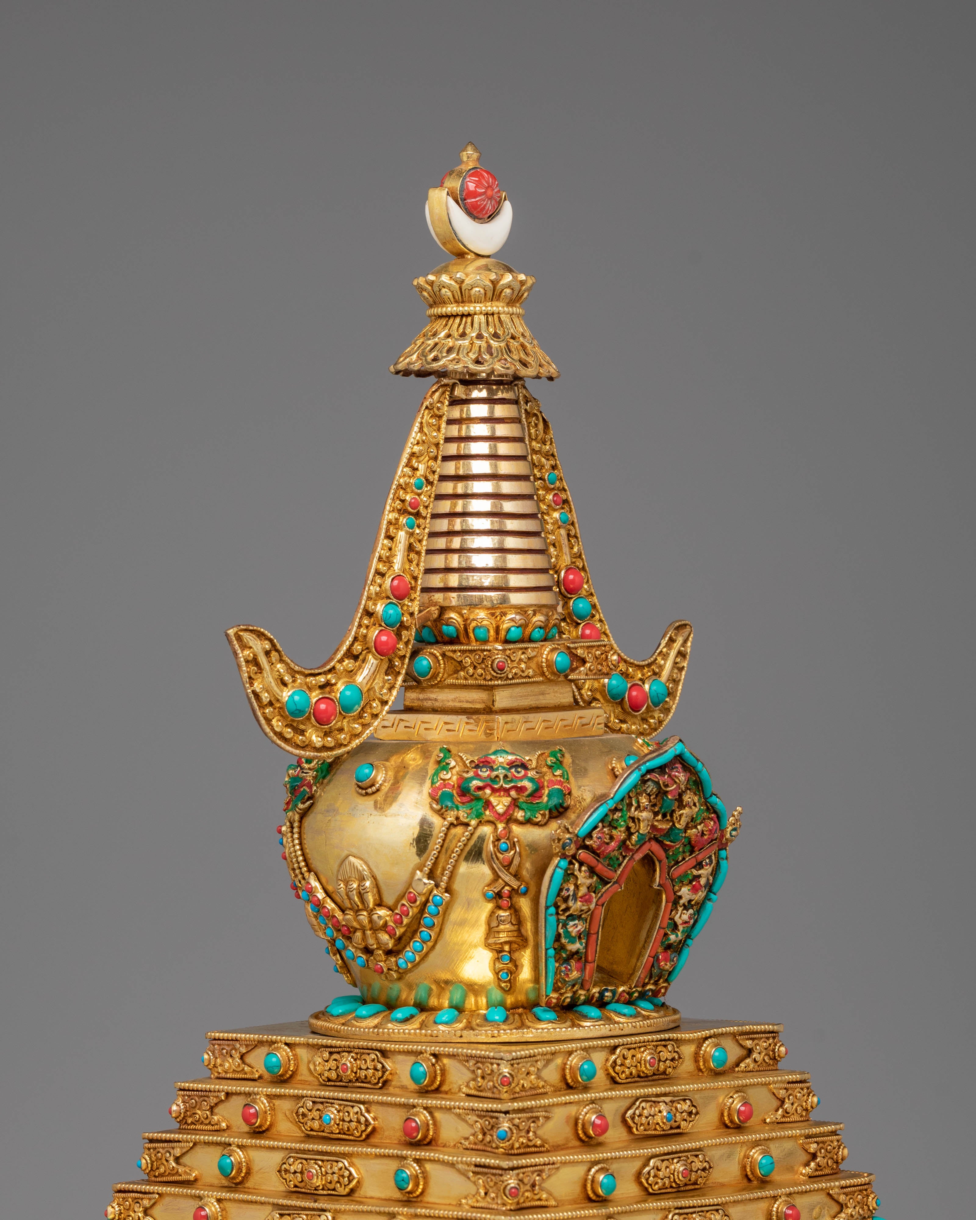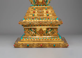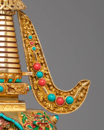 The stupa’s design is rich in Tibetan iconography, with coral and turquoise stones meticulously placed to enhance its vibrancy and symbolism. Coral represents protection, while turquoise is believed to promote healing, peace, and spiritual growth. The fire-gold plating gives the stupa a brilliant sheen, adding both aesthetic value and sacred energy to the piece. The multi-tiered base represents the levels of enlightenment, and the intricate carvings around the body depict divine figures and auspicious symbols. The canopy of the stupa is crowned with a symbolic jewel that signifies wisdom and spiritual clarity.