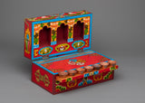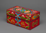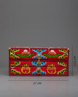 This gorgeous square Tibetan-style shrine box is beautifully handcrafted. The box has a small metal latch suitable for a small padlock, which makes it perfect for keeping jewels or other valuable belongings. This 100% handmade box has three compartments and a magnificent metal handle. The 7cm statue can be kept in three compartments.