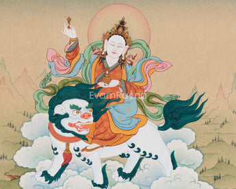 Tsheringma, the goddess of longevity, prosperity, and good fortune, is one of the Five Long-Life Sisters in Tibetan Buddhism. She grants vitality, wealth, and spiritual well-being, protecting practitioners from obstacles that shorten life or hinder prosperity. Depicted riding a snow lion, symbolizing strength, courage, and protection, she holds a vase of immortality nectar in her left hand. Her crown and nine-spoked vajra highlight her divine power to remove obstacles and grant longevity. This Tsheringma Canvas Print elegantly embodies her role as a goddess of long life, rendering it a compelling and inspiring addition to meditation spaces, altars, or sacred art collections.