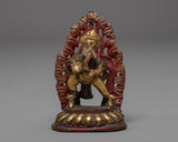 The Vintage Ganesh statue is hand-crafted using a copper body glided with genuine 24K gold. We have further used acrylic paintings to highlight features of the deity. Here the figurine is portrayed in the true form of iconography. Ganesh is depicted in a standing position on a mouse atop a lotus seat. He has an elephant face with three eyes.