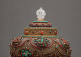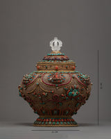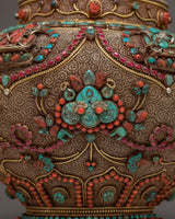 The traditional rice offering bowl is also known as gulpa is entirely a hand-carved item. The rice offering bowl is finely designed with seku making it more attractive and antique. The top lid holds a half vajra and the entire bowl is decorated with Coral, Turquoise, Lapis, and Crystal Stones to yield a rich and sensuous finish.