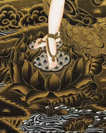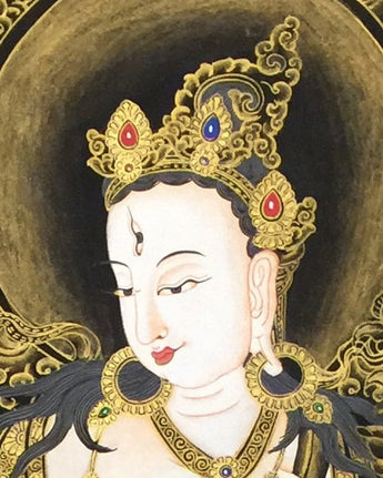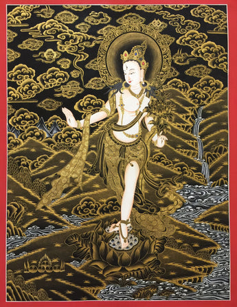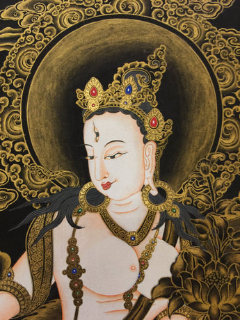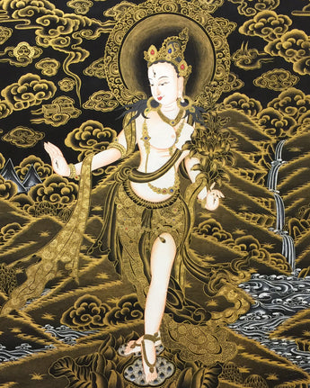 Our thangka is a handpainted Tibetan art done using traditional methods. It is a unique piece created using genuine 24K gold and natural stone colors.