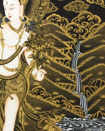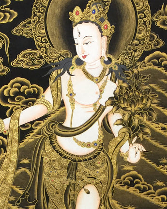 This gorgeous painting of the Standing White Tara is dominated by the use of 24 K gold against the black background to enhance the beauty of the use of Gold . It uses very less color ; primarily white and blue .