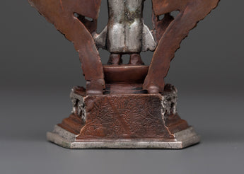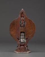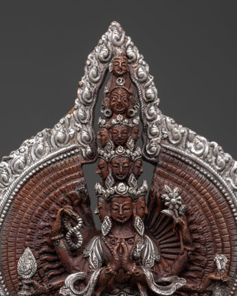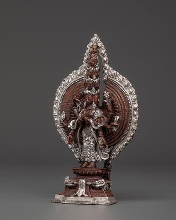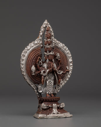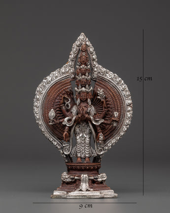 This Handcarved 1000 Armed Chenrezig Oxidized Copper Statue is 15 cm tall and 9 cm wide, and weighs 0.28 kilogram. It is crafted from oxidized copper with exquisite silver plating and features a solid base for stability, as well as elaborate decoration that reflects its Tibetan heritage. Its small size makes it ideal for home altars, meditation areas, or workplace places, adding a magical touch to any environment.