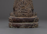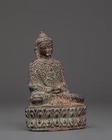 This magnificent Amitabha Buddha Statue for Buddhist decor is 14 cm in height, 10.5 cm in breadth, and weighs 0.69 kilogram. The statue, crafted from oxidized copper, has meticulous workmanship that symbolizes the eternal grace of Buddhist creativity. The aged copper surface gives it an ancient appearance, making it an ideal centerpiece for meditation areas, altars, and spiritual collections.