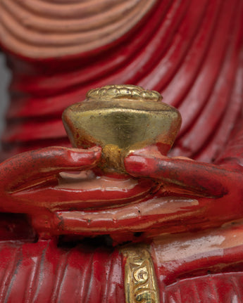 The Amitabha Buddha Statue comprises a copper body with 24k gold plated on the bowl held by a deity. Deity depicted sitting atop a moon disc lotus seat holding an alms bowl with both hands is exclusively mesmerizing, which can be a perfect gift from Nepal to a practitioner like you.