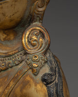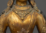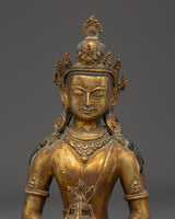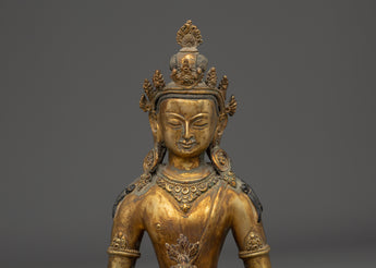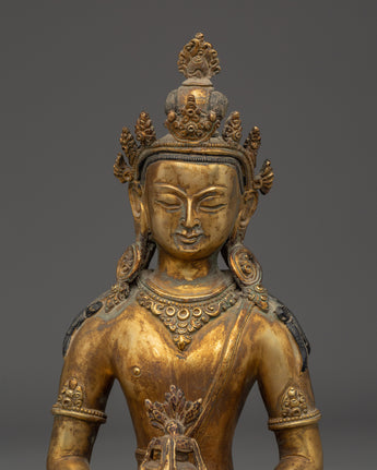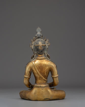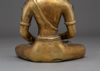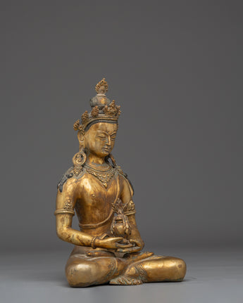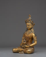 This Amitayus Buddha Sculpture is a potent spiritual symbol as well as a magnificent decorative item, making it ideal for collectors, practitioners, and enthusiasts of Buddhist art. It embodies Amitayus Buddha's blessings, making it appropriate for use in meditation, rituals, and spiritual ceremonies. Add this gold-plated copper Tibetan statue to your holy area to bring the energy of longevity, wealth, and spiritual awakening into your life.