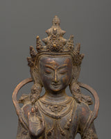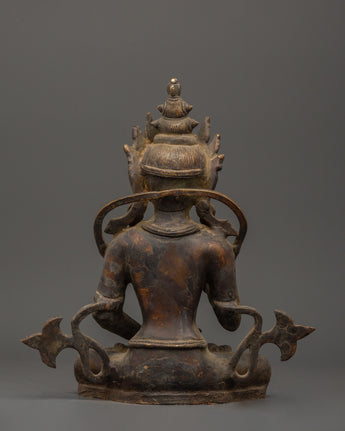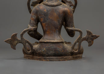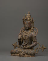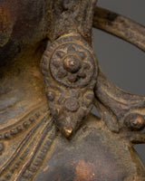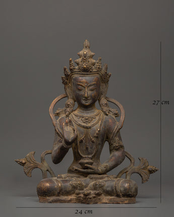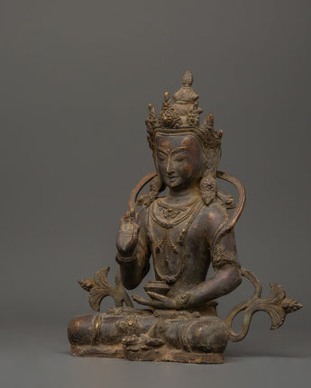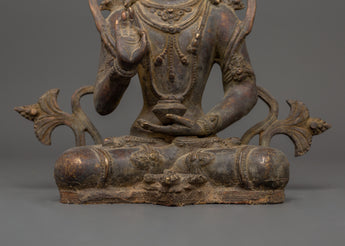 This finely crafted brass statue, measuring 27 cm tall and 24 cm wide, exudes tranquil vitality. Amoghasiddhi's serene yet powerful countenance symbolizes the transformation of envy into wisdom, while his distinctive hand gesture (mudra) indicates protection and fearlessness. Whether displayed in a home temple, yoga studio, or meditation room, this precious artifact is a powerful reminder of inner serenity and spiritual growth.
