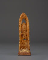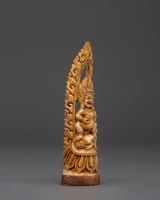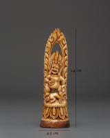 Black Dzambhala stands with a ferocious face, clutching a skullcup, indicating his capacity to lift poverty and bestow plentiful riches to those who seek his blessings. His protective aura and loving heart combine to provide material and spiritual abundance while shielding believers from harmful influences and suffering. The fiery halo around the figure represents a transforming force. The beautiful engraving emphasizes these spiritual aspects while welcoming blessings and protection.