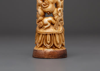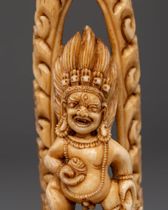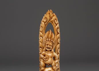 This wonderfully sculpted Black Dzambhala statue is 14cm tall and 4.5cm wide, made of ethically sourced yak bone and has a wooden base. The statue, weighing 0.056kg, depicts Black Dzambhala, the wrathful deity of wealth and prosperity, in a wrathful position, clutching symbolic ceremonial tools and standing on a corpse beneath his feet, represents victory over greed and ignorance..