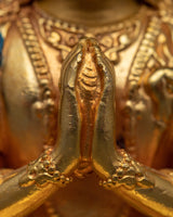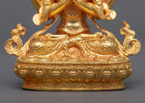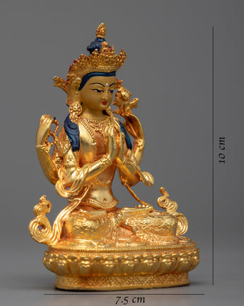 The Bodhisattva Four-Armed Chenrezig Statue is a majestic expression of compassion and enlightenment, precisely made from copper and embellished with sumptuous 24k gold plating. Standing at 10cm tall, this magnificent statue exudes the holy presence of Chenrezig, also known as Avalokiteshvara, the Bodhisattva of Compassion.