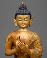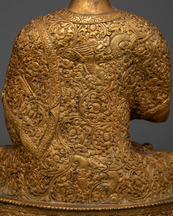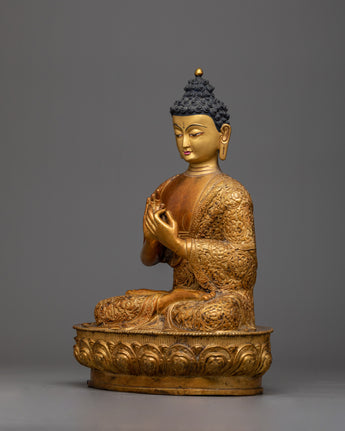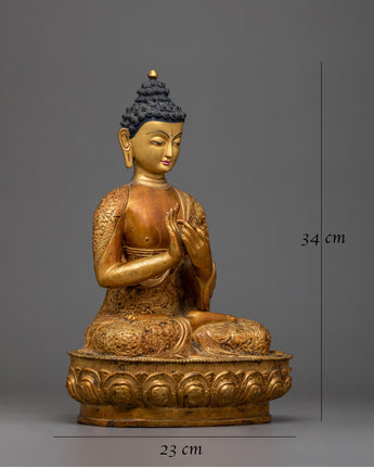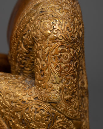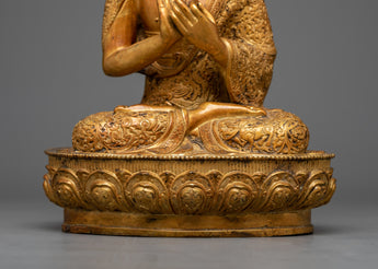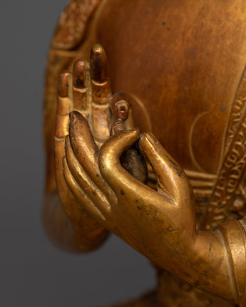 With the exquisitely designed Bodhisattva Vairocana Statue, which is lavishly gilded in 24k gold and has a copper body, you can set out on a voyage of spiritual enlightenment. This statue, which is 34 cm tall and 23 cm wide, exudes a sense of heavenly wisdom and compassion. Its 3.61 kg weight causes it to become the center of a sacred energy field wherever it is placed.