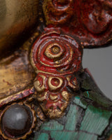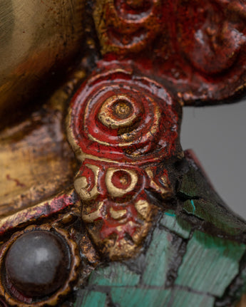 This statue, skillfully created by expert artisans, boasts incredible detail in its brass body and stone inlay. The vibrant tones of coral and turquoise provide brightness and spiritual depth, making it a valuable addition to your collection. Guru Rinpoche, also known as Padmasambhava, is widely regarded as the creator of Tibetan Buddhism, embodying incredible wisdom and compassion. Enhance your meditation practice, set a peaceful mood, or give this beautiful item to a loved one who adores spiritual beauty.