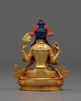 The deity is depicted sitting on the moon disc on a lotus, holding a lotus in his upper left hand, a wish-fulfilling jewel in his upper right hand, and a crystal rosary in his upper right hand. The skills we use have been passed on for centuries by our ancestors. It took us months of laborious effort to sculpt the copper body of Chenrezig and glide it with gold.