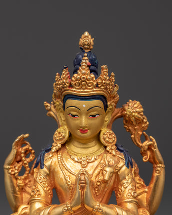 The Chenrezig Copper Statue portrays the four-armed form of Avalokiteshvara, the bodhisattva of compassion in Tibetan Buddhism. This statue measures 11 cm in height, 8.5 cm in width, and weighs 0.25 kg. It is made of copper and wonderfully plated in gold. Chenrezig is seated in the full lotus posture, his front hands unified at the heart in the prayer mudra, representing the unification of wisdom and compassion.