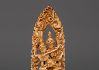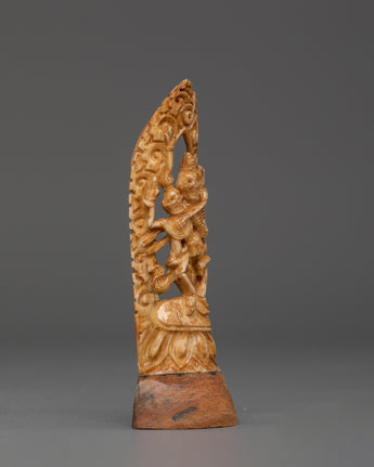 The Chitipati is hand-carved on ethically sourced buffalo bone, making it an eco-friendly and sustainable choice. The intricate details of the carving are impressive, with a high level of skill and craftsmanship evident in every line and curve. The Chitipati figure is a powerful symbol in Tibetan Buddhism, representing the ultimate triumph of life over death. It is also believed to be a protector of the practitioners of the Vajrayana path. This piece is not only a stunning work of art but also a meaningful representation of a vital aspect of Tibetan Buddhist practice.