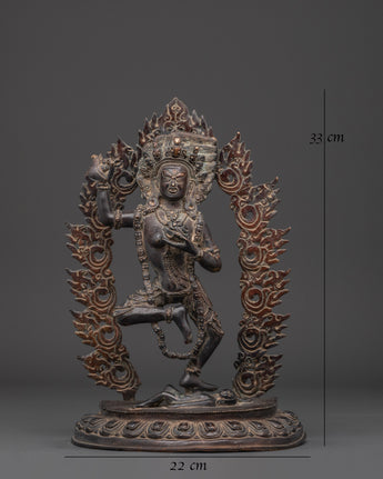 This copper Dorje Phagmo statue beautifully depicts Vajravarahi, the fierce yet compassionate Tibetan dakini associated with transformation, inner strength, and wisdom. Measuring 33 cm in height and 22 cm in width and weighing 2.96 kg, it is skillfully handcrafted from copper and finished with an antique patina that echoes centuries-old Himalayan craftsmanship.