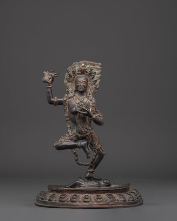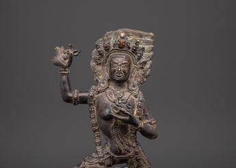 Every fine detail, from the expressive face to the ornate crown, posture, and symbolic tools, is carefully carved by master artisans using traditional Tibetan metalworking techniques. The aged finish enhances the texture and spiritual significance, making it suitable for sacred rituals, shrine display, or deep meditation. As a tantric deity, Dorje Phagmo symbolizes the union of wisdom and action, serving as a powerful aid for practitioners on the Vajrayana path.