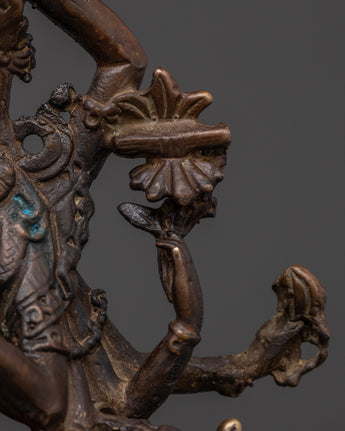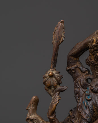 The beautifully sculpted statue, created in copper, represents Manjushri in his multi-armed tantric manifestation, with hands forming the Dharmachakra Mudra, the gesture of teaching and turning the Wheel of Dharma. The Namasangiti transcendence embodies the convergence of method and wisdom, as well as compassion and understanding. This sacred image serves as both a visual aid for meditation and a powerful reminder of enlightened wisdom. Whether you practice Vajrayana Buddhism, collect Tibetan relics, or seek transforming energy for your spiritual space, this piece is a valuable addition.