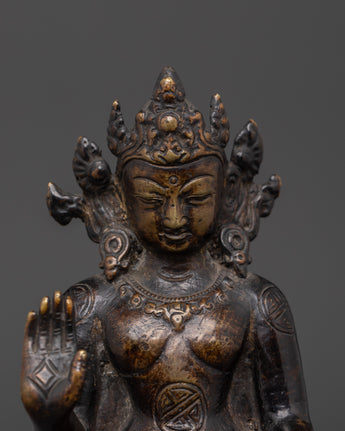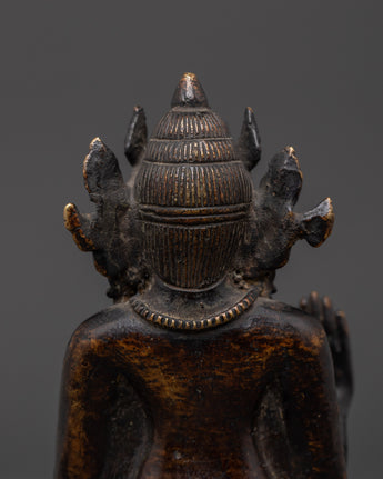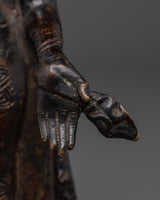 This sculpture's design highlights meticulous details, from the Buddha's tranquil look to the delicate folds of the robe. Hand gestures (or mudras) are meticulously designed to represent blessings and protection. The designs on the figure represent the Buddha's wisdom and compassion, bringing peace and mindfulness into your surroundings. The oxidized copper finish highlights the sculpture's unique patina, giving it a standout feature in any setting.