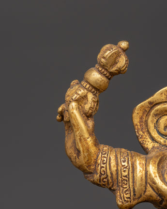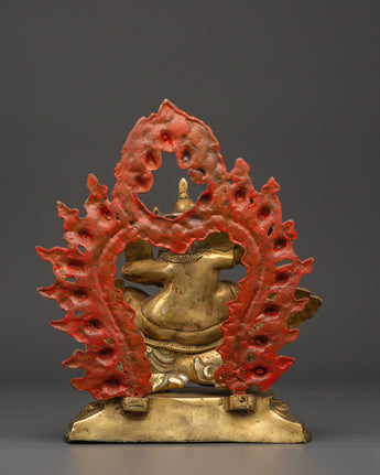 Dorje Lekpa, also known as Vajra Sadhu, is a wrathful Dharmapala, revered for dispelling obstacles and safeguarding spiritual practitioners. In Buddhist tradition, the flames surrounding Dorje Legpa represent purification and transformation, as well as the eradication of ignorance and negativity. The deity's controlling and enraged visage demonstrates dedicated protection for practitioners and promotes spiritual progress.