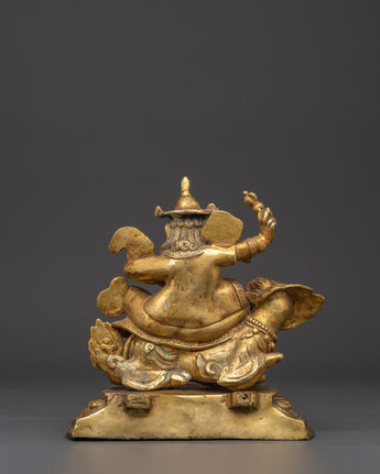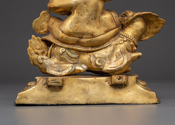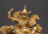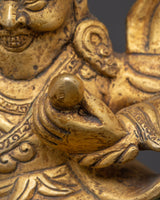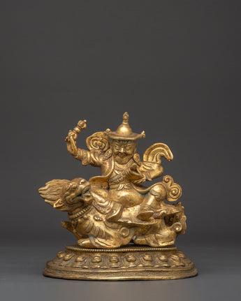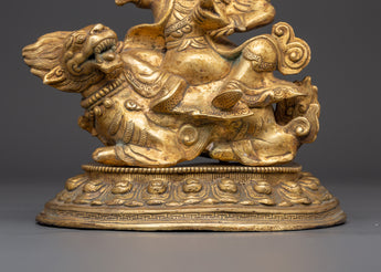 This magnificent copper Dorje Legpa statue is 9.5 cm tall and weighs 3.62kg. It depicts the ferocious Tibetan deity riding a mighty snow lion. Dorje Legpa expresses enlightened beings' intense compassion while embodying spiritual force and protection. The snow lion denotes youthful energy and power over primeval energies, emphasizing the deity's capacity to conquer challenges on the spiritual path.