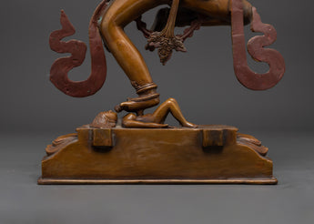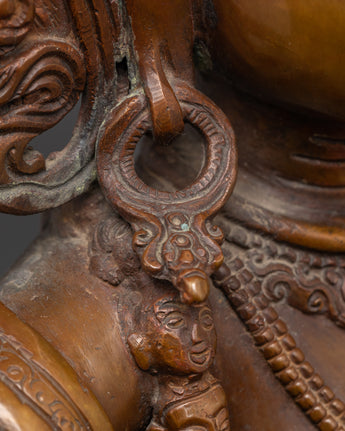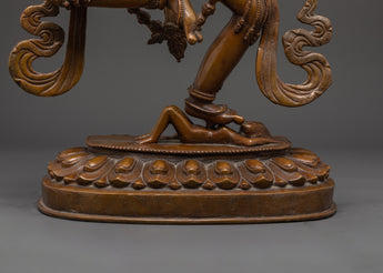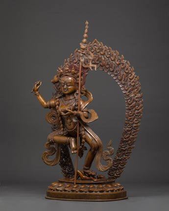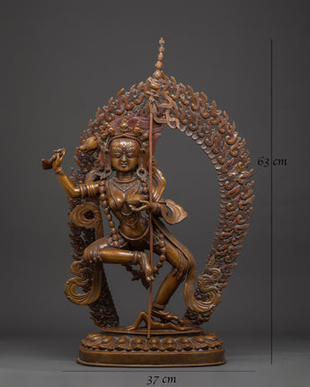 Bring home the transformative force of this Dorje Phagmo Wrathful Deity Statue, a stunning portrayal of the revered Vajravarahi, the "Diamond Sow." This statue, which stands 63cm tall and 37cm broad, is masterfully carved from oxidized copper and captures every tiny feature of Dorje Phagmo's strong, dynamic personality. Weighing 10.63kg, this extraordinary item is intended for serious collectors, Buddhist practitioners, and those looking for a striking focal point for their shrine or altar.
