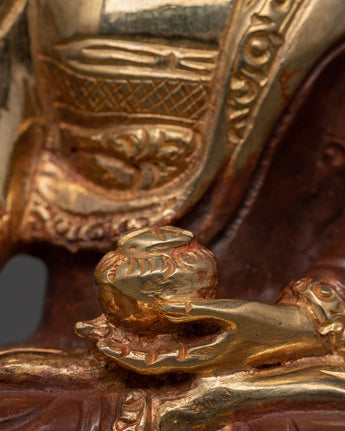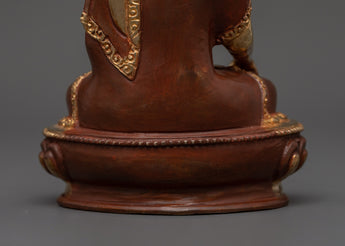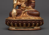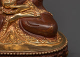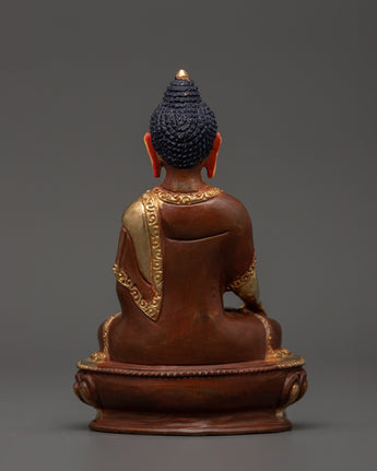 The Elegant Shakyamuni Buddha Statue is a handmade masterwork representing peace and enlightenment. This stunning statue, measuring 15.5 cm tall and 10.5 cm broad, is skillfully fashioned from oxidized copper and plated with gold, giving it a timeless and religious appearance. Shakyamuni Buddha, the historical Buddha and founder of Buddhism, represents the height of spiritual awareness and inner peace.