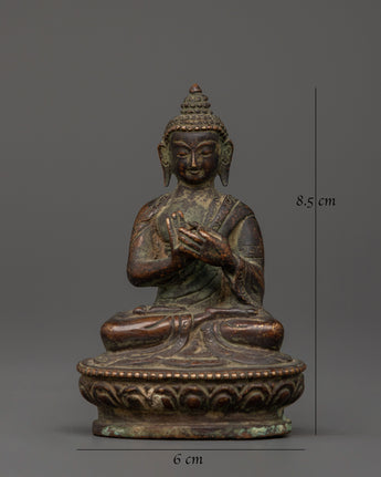 Elevate your sacred area with this wonderful Enlightenment Vairocana Buddha statue, which is 8.5cm tall and made of copper. This intricately carved sculpture depicts the serene presence of Vairocana, the universal Buddha, who embodies cosmic harmony. This statue is ideal for meditation rooms or Tibetan Buddhist collections, as it serves as a powerful spiritual tool that promotes mindfulness and inner calm.