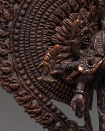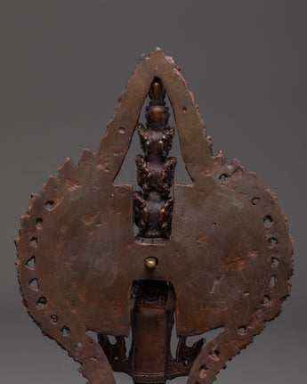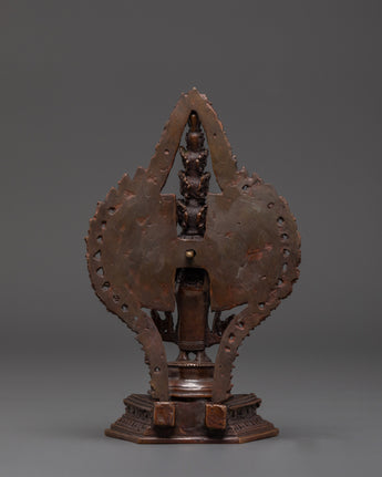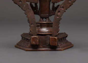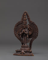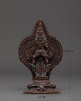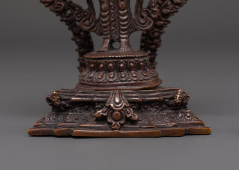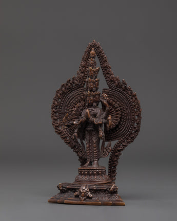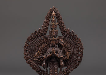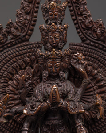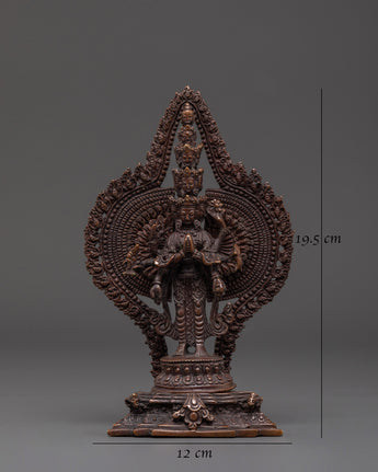 This gorgeous 1000-Armed Chenresig Statue is 19.5cm tall and 12cm wide, made of oxidized copper, and will add a classic, religious sense to your spiritual environment. The statue depicts Tibetan Avalokiteshvara, the Bodhisattva of Compassion, with a thousand arms representing boundless kindness and protection. This statue, weighing 0.64 kg, features precise details that showcase traditional craftsmanship, making it an ideal focal point for meditation altars, spiritual décor, and mindfulness practices. The statue's corroded copper surface lends it a truly vintage look, making it appealing to collectors and devotees alike.