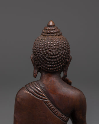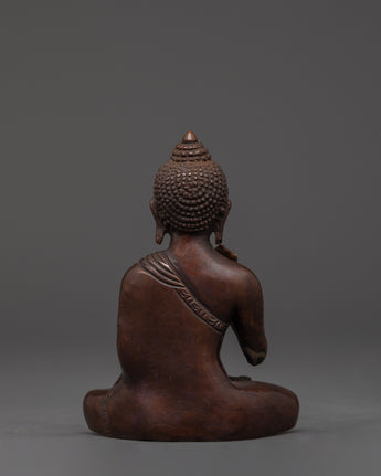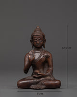 This statue of Tibetan Amoghasiddhi is ideal for a meditation room, a personal shrine, or a hallowed ceremonial area. The oxidized copper finish provides a classic style and adds to its classic appearance. Amoghasiddhi's characteristic brave gesture, known as abhaya mudra, shields the practitioner from spiritual challenges and encourages enlightened action. The statue is grounded and portable because of its small size and weight.