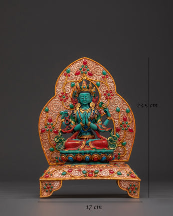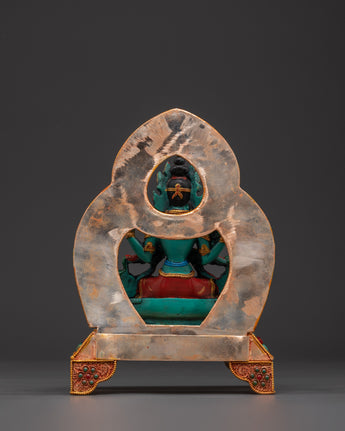 Four Armed Chenrezig with Halo and Throne Base | Tibetan Compassion Deity Sculpture