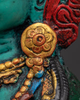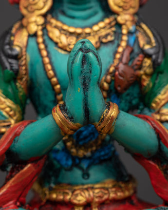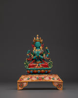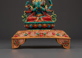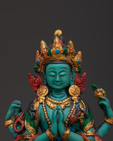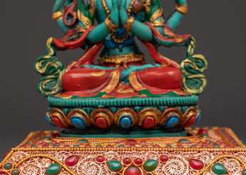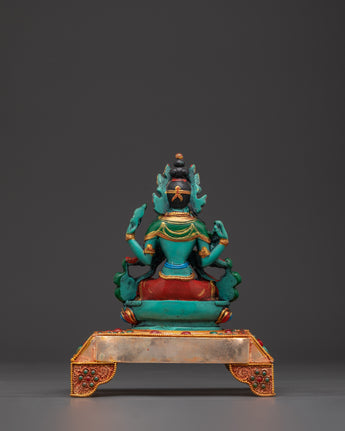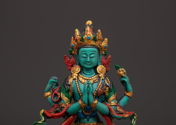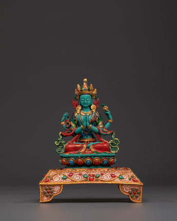 The statue is made of copper with gold plating to create a brilliant, mystical atmosphere. The statue is adorned with beautiful filigree work and embellished with artificial stones such as turquoise and coral, giving it a vibrant, regal aspect. The intricate halo and throne base reflect Chenrezig's purity and compassion, making it an excellent centerpiece for meditation rooms, spiritual shrines, or as a treasured gift.  The golden finish and bright stones give depth and spiritual vibrancy, creating a peaceful and pleasant environment. This Chenrezig Statue is ideal for collectors, practitioners, and fans of sacred art, as it adds atmosphere to any area while acting as a visual and spiritual reminder of compassion and loving-kindness.