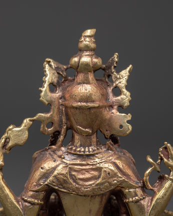 This beautifully crafted Chenrezig statue depicts the four-armed deity of compassion, representing unlimited generosity and mercy. It is 11.5cm in height and 8.5cm in breadth, and has a robust brass body weighing 0.33kg. It is a sacred and attractive complement to any meditation altar or holy area.