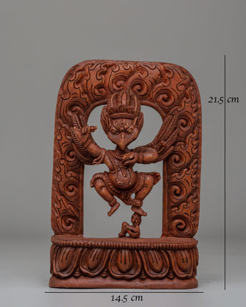 This magnificent Garuda statue is a hand-carved wooden sculpture, capturing the essence of the divine bird deity from Hindu and Buddhist mythology. Standing at 21.5 cm tall and 14.5 cm wide, this statue depicts Garuda in his majestic form, symbolizing strength, protection, and spiritual power. The intricate details on the wood bring the mythical figure to life, making it a stunning piece of home decor with deep spiritual significance. Whether placed on an altar, in a meditation room, or as a centerpiece in your living space, this Garuda statue serves as a powerful reminder of courage, freedom, and divine protection.