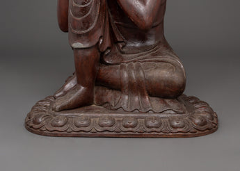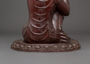 Every feature of this Buddha sculpture has been carefully carved by expert artisans, showcasing the wood's beautiful grain and texture. The statue's flowing robes, tranquil facial expression, and exquisite lotus base demonstrate both artistic excellence and spiritual value. Placing this Buddha statue in your holy area promotes attention, serenity, and positive energy. The natural wood material not only provides warmth and organic beauty, but it also adheres to the Buddhist precept of living in balance with nature.