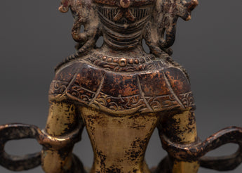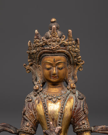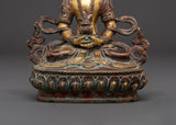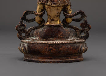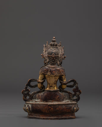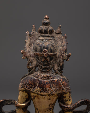 This Handcrafted Amitayus Statue is a representation of Amitayus, the Buddha of Long Life, known for his blessings of health, longevity, and vitality. Standing at 16cm tall, this finely crafted statue is made from copper with an antique finish, making it a beautiful and meaningful addition to your spiritual or meditation space. Amitayus symbolizes the abundance of life force and is believed to help extend one's life and promote well-being, making this statue a powerful tool for those seeking to enhance their vitality and spiritual journey.