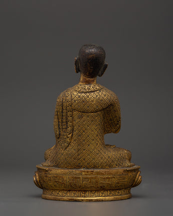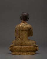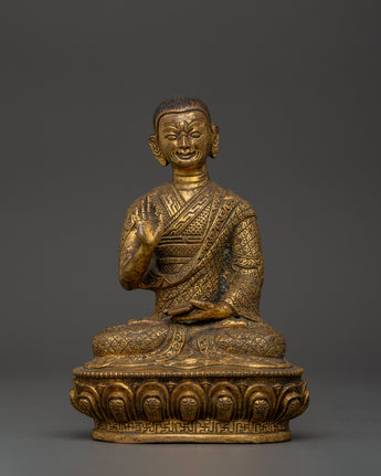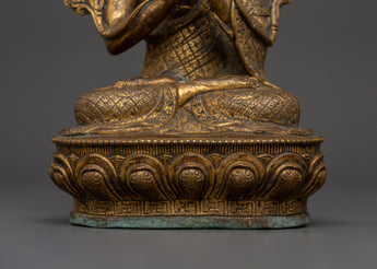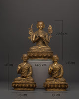 This handcrafted brass body of Tsongkhapa with Je Gyaltsab and Je Khedrup. This breathtaking trio of Tibetan Buddhist monks represents the enlightened heritage of the Gelug faith. In the center is Je Tsongkhapa, the great 14th-century teacher, philosopher, and founder of the Gelug school. Tsongkhapa, renowned for his profound insights, pure ethics, and scholarly teachings, is sometimes regarded as a manifestation of Manjushri, the Bodhisattva of wisdom. His statue is 20.5 cm in height and 14.5 cm in width, and exudes presence and calm. Flanking him are his devoted heart followers, Je Gyaltsab and Je Khedrup, 18 cm tall and 13 cm wide, captured in contemplative silence with hands uplifted in the Abhaya Mudra, representing fearlessness and protection. All three are seated on exquisite lotus moon discs representing purity, enlightenment, and the spiritual path.
