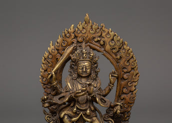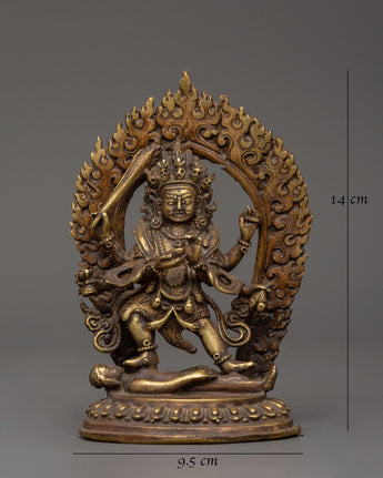 This handcrafted Brass Mahakala Statue measures 14cm tall and 9.5cm wide, making it an ideal addition to any spiritual area or meditation shrine. Mahakala, the mighty defender of the Dharma, is represented by six arms, each wielding sacred weapons, symbolising his ability to overcome obstacles and protect practitioners from negative influences. His wrathful appearance transforms negative energy into wisdom and compassion, while his attitude of stepping on a corpse signifies his mastery over ignorance and destructive forces. This magnificent statue represents strength, purity, and spiritual protection.