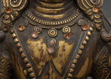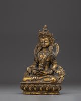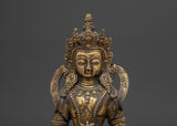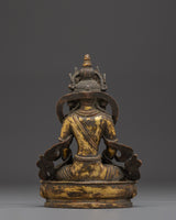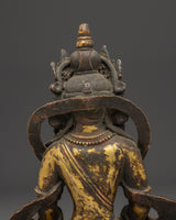 The Amitayus statue is meticulously sculpted, capturing the Buddha's tranquil and compassionate look. Amitayus is shown with his hands holding the nectar of immortality, which represents healing, longevity, and divine nourishment. The lotus base beneath him symbolizes purity, knowledge, and spiritual change. The statue's grace is enhanced by its antique polish and gold plating, which creates a perfect balance of spiritual meaning and artistic beauty.