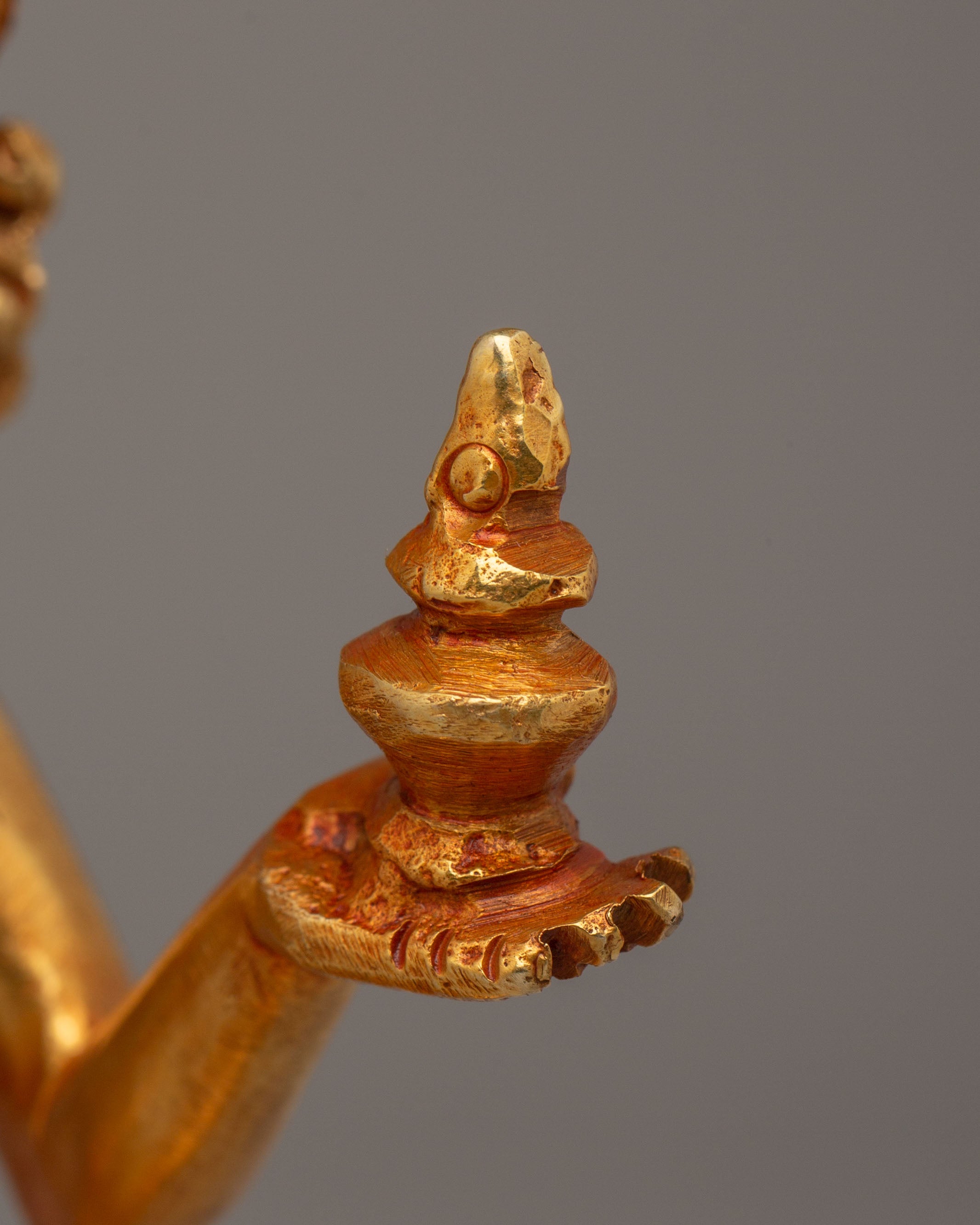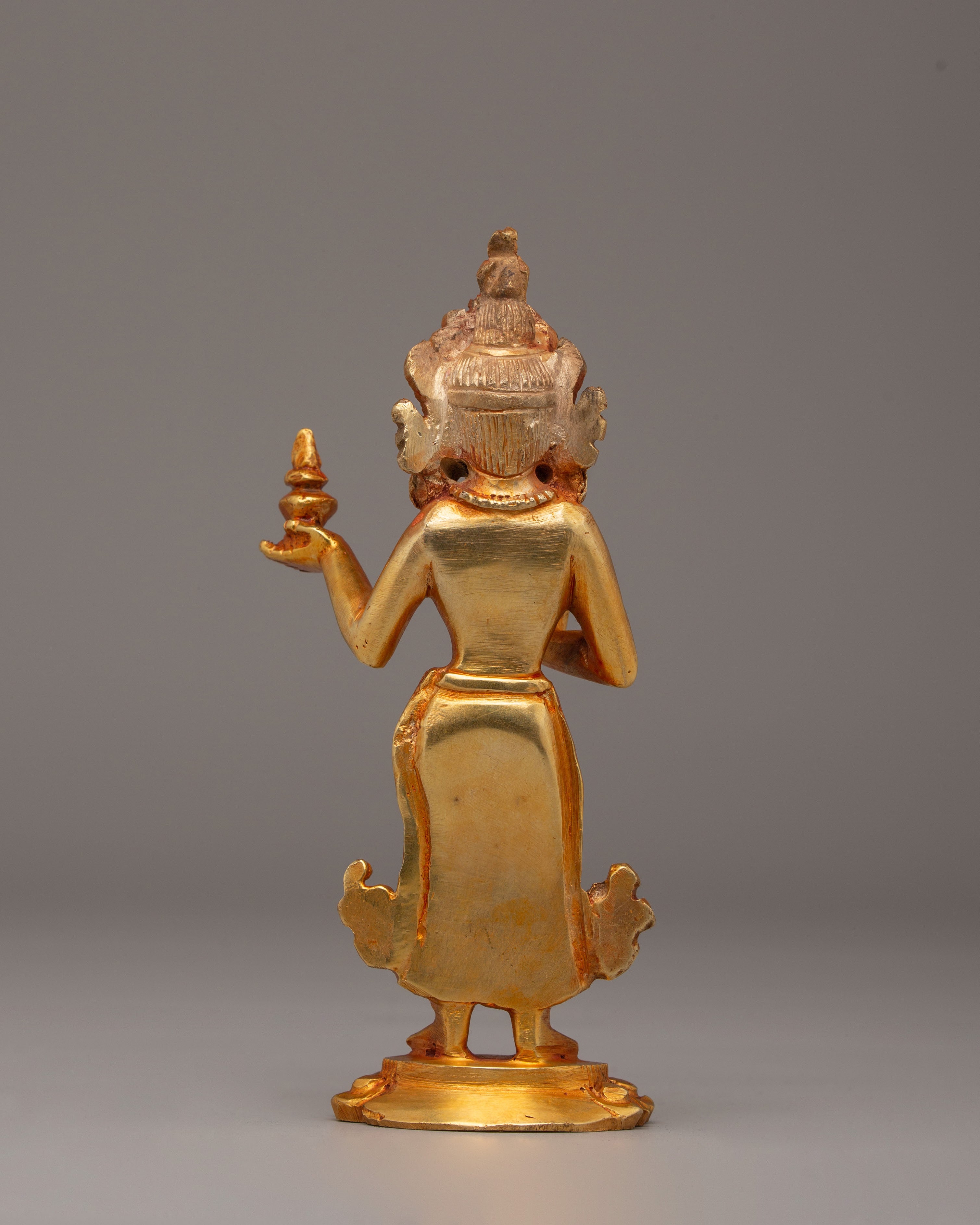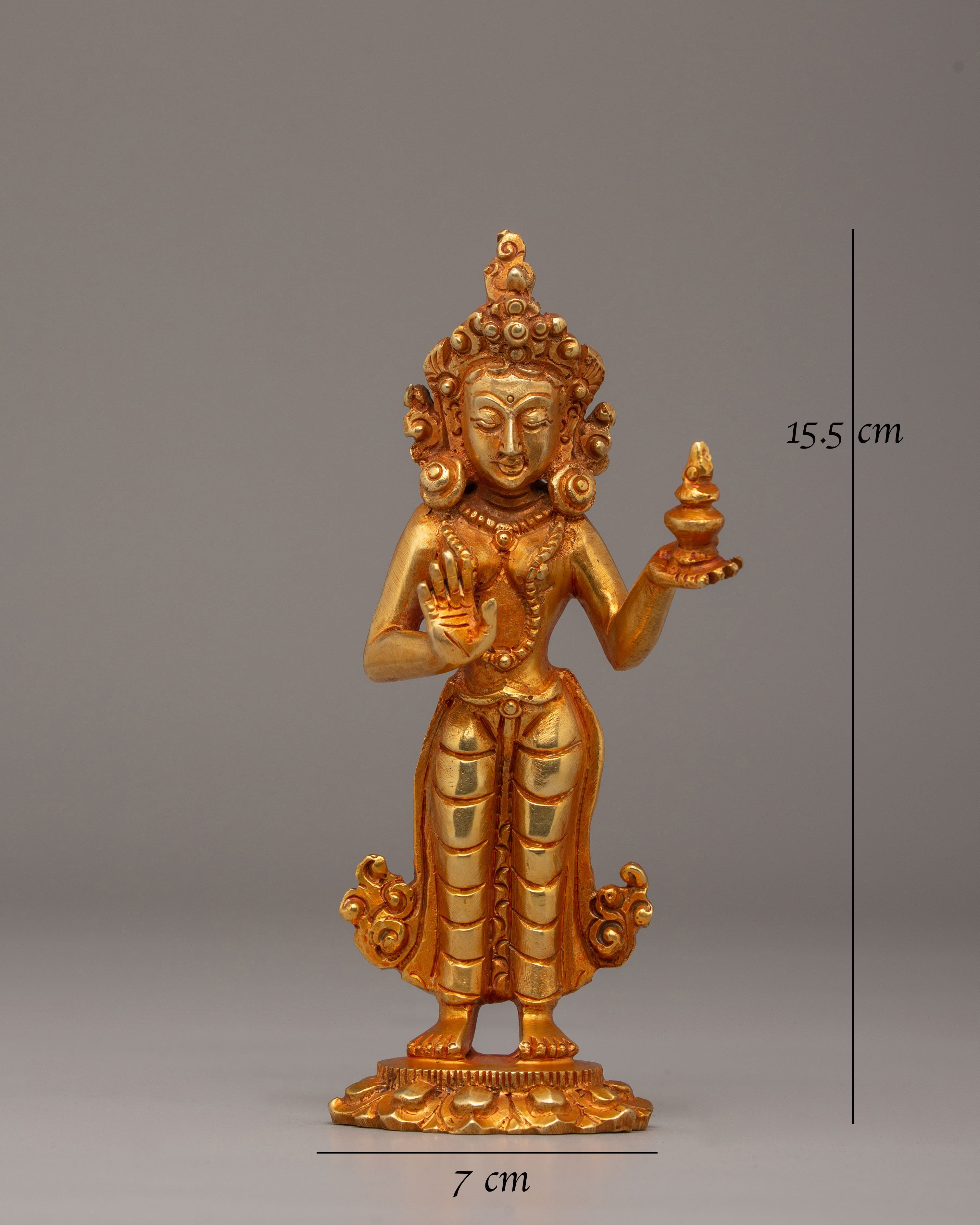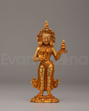 The Mandarva Buddha Statue is a sacred representation of Mandarva, one of the principal female disciples of Guru Padmasambhava and a revered figure symbolizing wisdom, spiritual accomplishment, and enlightened devotion in Tibetan Buddhism. Measuring 15.5 cm in height and 7 cm in width, and weighing 0.45 kg, this beautifully crafted sculpture features a copper body enhanced with elegant electro gold plating. The fine detailing and graceful posture reflect traditional Himalayan artistry, making this statue a meaningful addition to personal altars, meditation spaces, and spiritual collections.