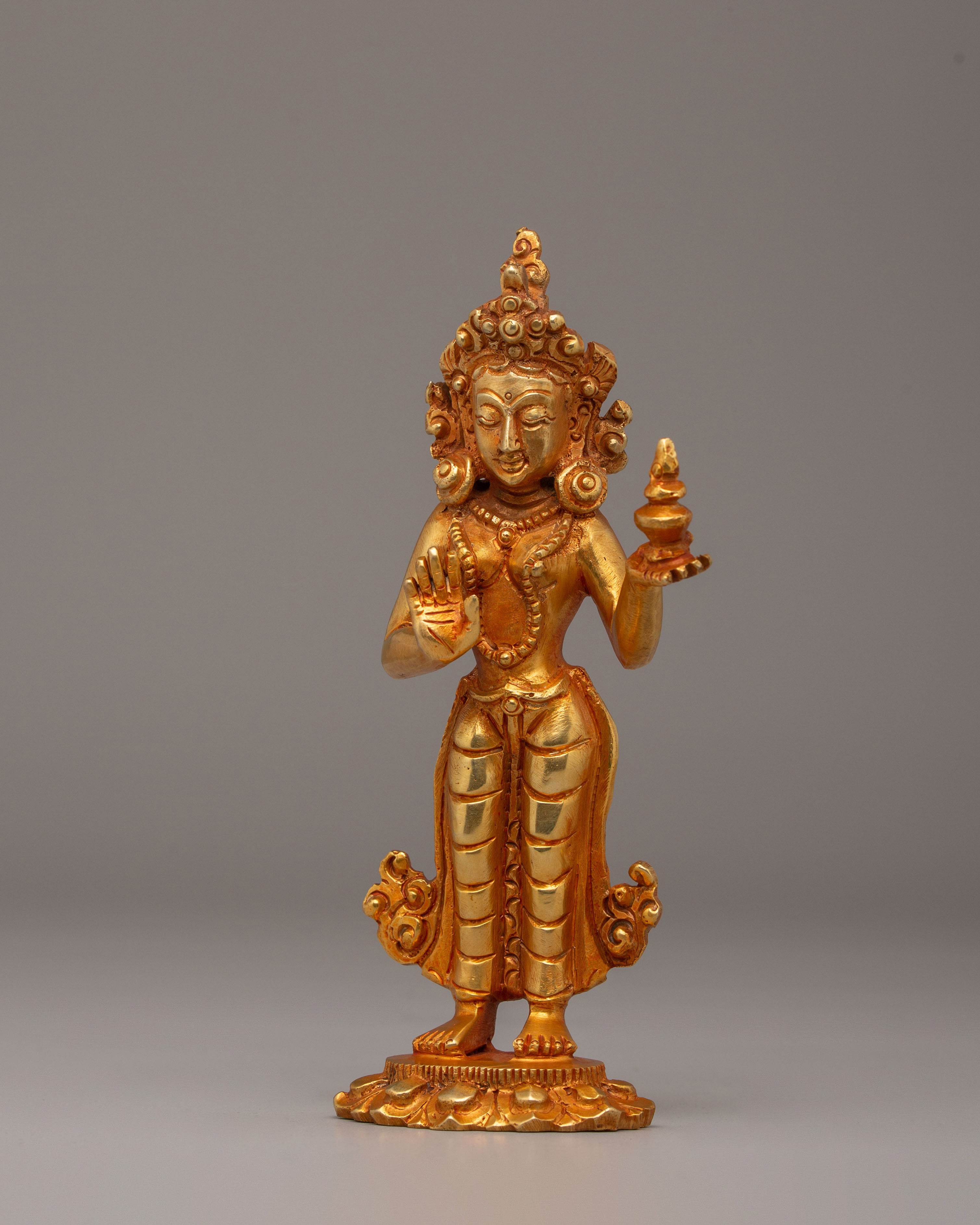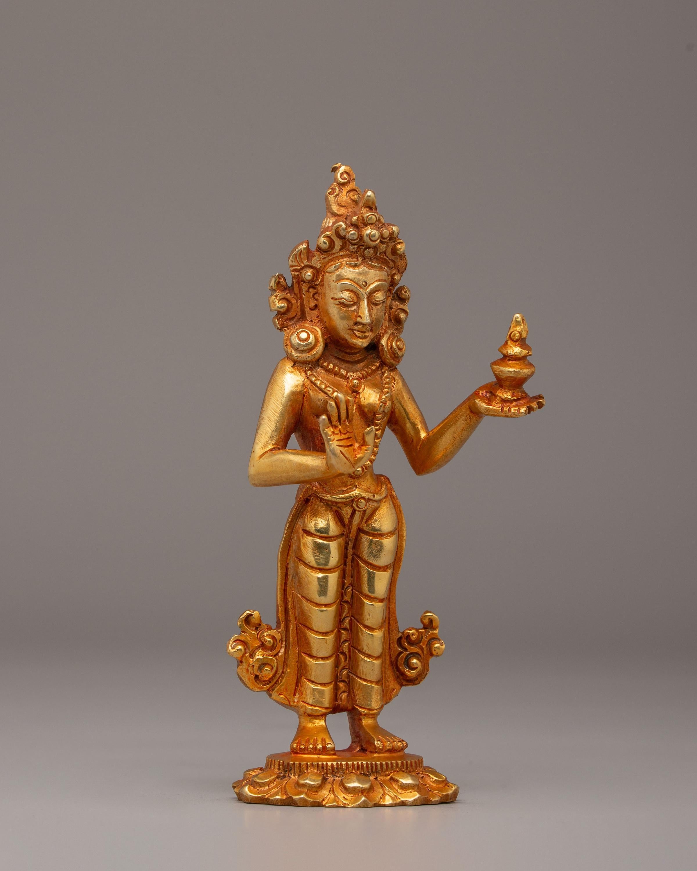 This Mandarva Statue is depicted in a serene seated posture that represents meditative awareness and spiritual discipline. She often holds a sacred vase or ritual object symbolizing longevity, blessings, and spiritual attainment. Her calm facial expression reflects compassion and enlightened understanding, while the ornate crown and flowing robes signify her elevated spiritual status. The lotus base beneath her represents purity and spiritual awakening rising above worldly attachments.