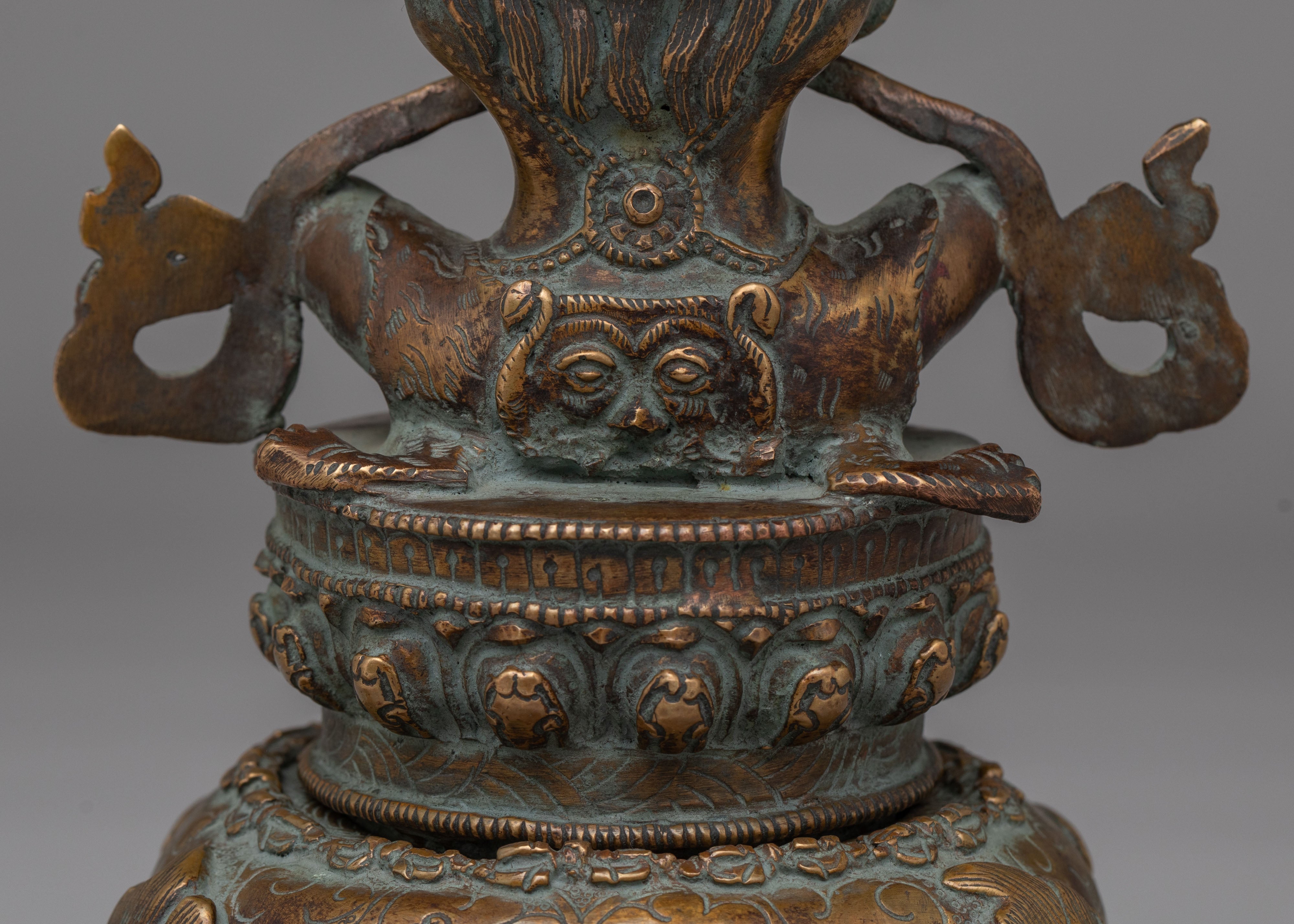 The copper body of the statue has been expertly finished with an antique effect, enhancing its visual appeal and giving it an ancient, sacred look. The design showcases delicate and highly detailed carvings, from the fierce expression of Vajradhaka to the ornate patterns adorning the statue’s body. The antique finish adds a timeless quality to the statue, making it not only a ritual object but also an exquisite piece of art that reflects the tradition and spiritual significance of Vajradhaka. The pose and posture of the deity further emphasize the themes of protection and the relentless power of wisdom.