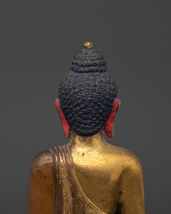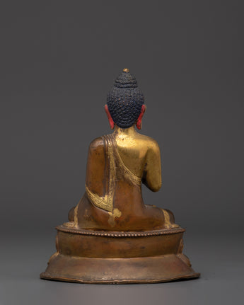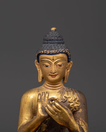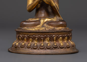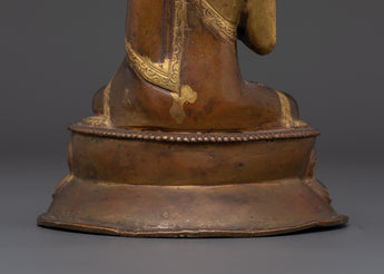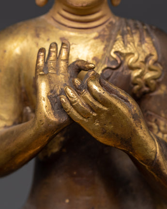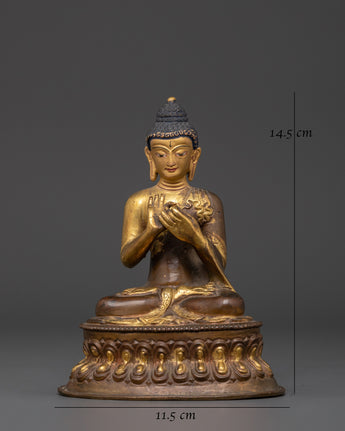 The workmanship demonstrates a strong respect for traditional Buddhist symbolism. The statue is beautifully hand-finished, with precise gold plating emphasizing crucial details such as the subtle patterns on the robe and Vairocana's uplifted hands. The oxidized copper body creates a rich, earthy contrast that complements the statue's ancient aspect and spiritual atmosphere. Every curve and shape is carefully crafted to evoke a feeling of calm and heavenly presence.