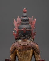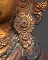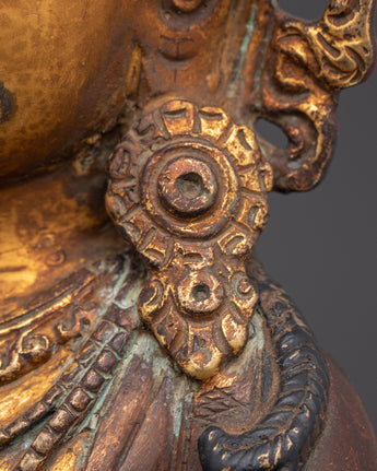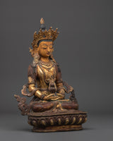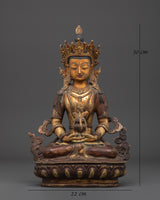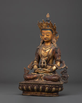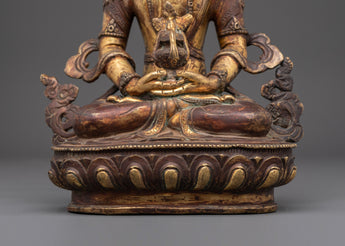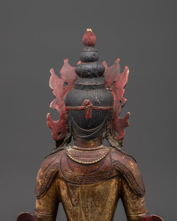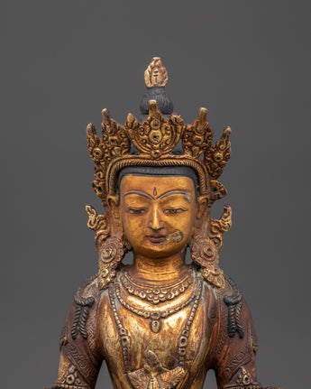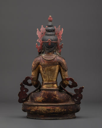 Created by skilled artisans using traditional methods, the statue's oxidized copper offers a rich, aged look, while the gold highlights add a gentle, radiant glow. The antique finish on the face emphasizes Amitayus's wisdom and compassion, making this statue a meaningful addition to your spiritual environment. More than just a decorative object, it serves as a symbol of health, longevity, and spiritual healing, providing ongoing blessings and positive energy in your home or meditation space.