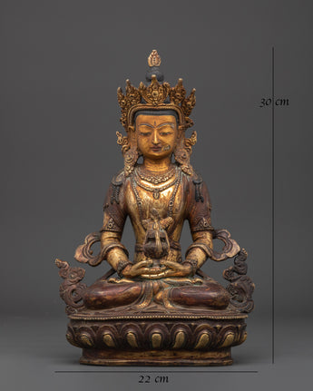 This handmade copper Buddha Amitayus statue exemplifies exquisite spiritual craftsmanship. Measuring 30 cm in height and 22 cm in width, it is crafted from high-quality copper with an oxidized finish and gold plating that accentuate its intricate details. Amitayus, the Buddha of Infinite Life, is depicted with a serene expression and a posture symbolizing longevity and blessings. The face features an antique finish, adding a timeless, aged appearance that enhances its sacred presence and spiritual depth.