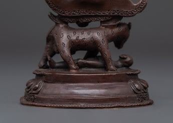 The statue has a distinctive finish that reflects the transforming spirit of Dorje Drollo. The detailed pattern portrays his ferocious posture, which represents defense and resilience. The lion beneath him indicates strength, emphasizing his status as a formidable protector. This fantastic item enhances the spiritual depth of any Buddhist altar or shrine by serving as a constant reminder of strength and spiritual force.